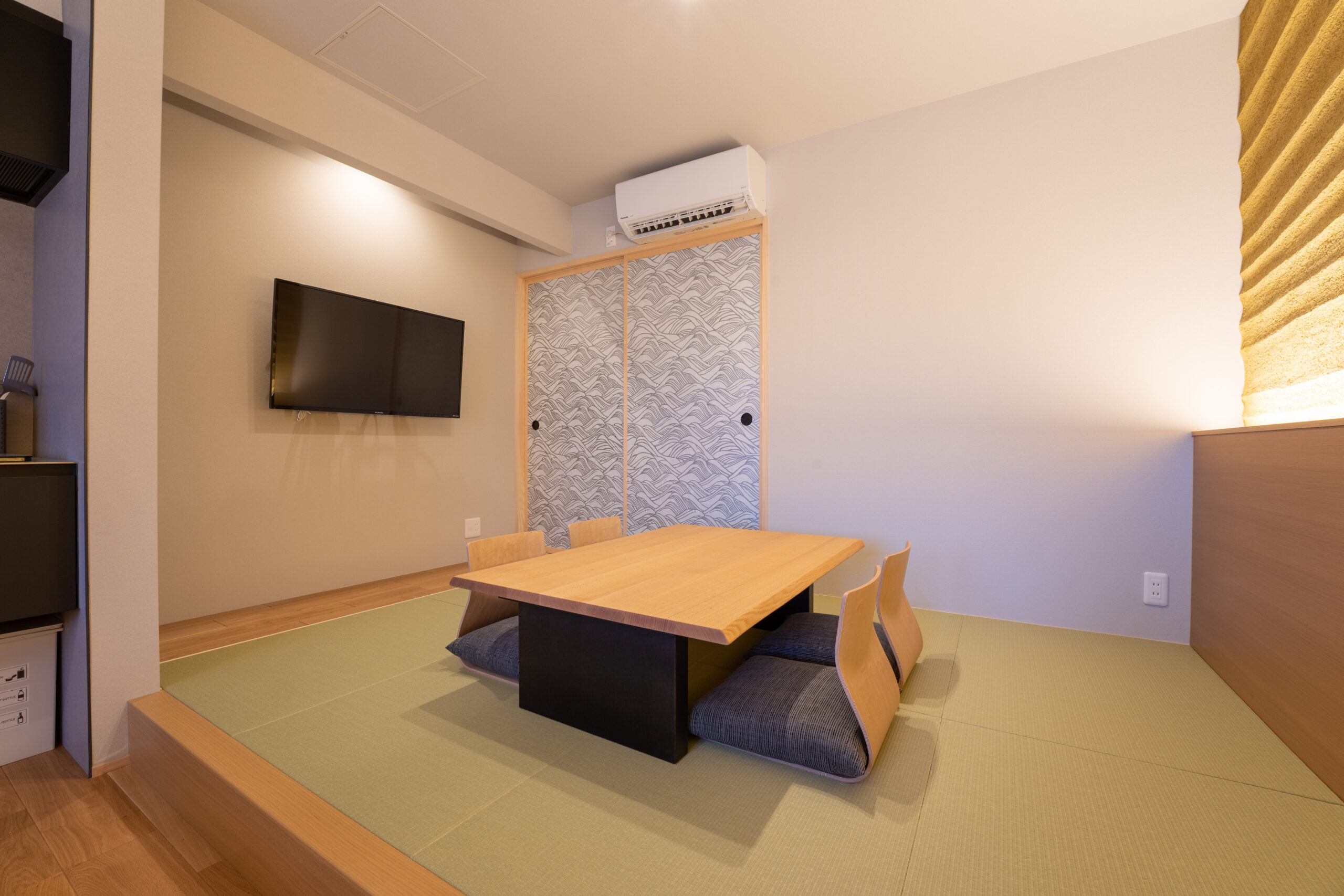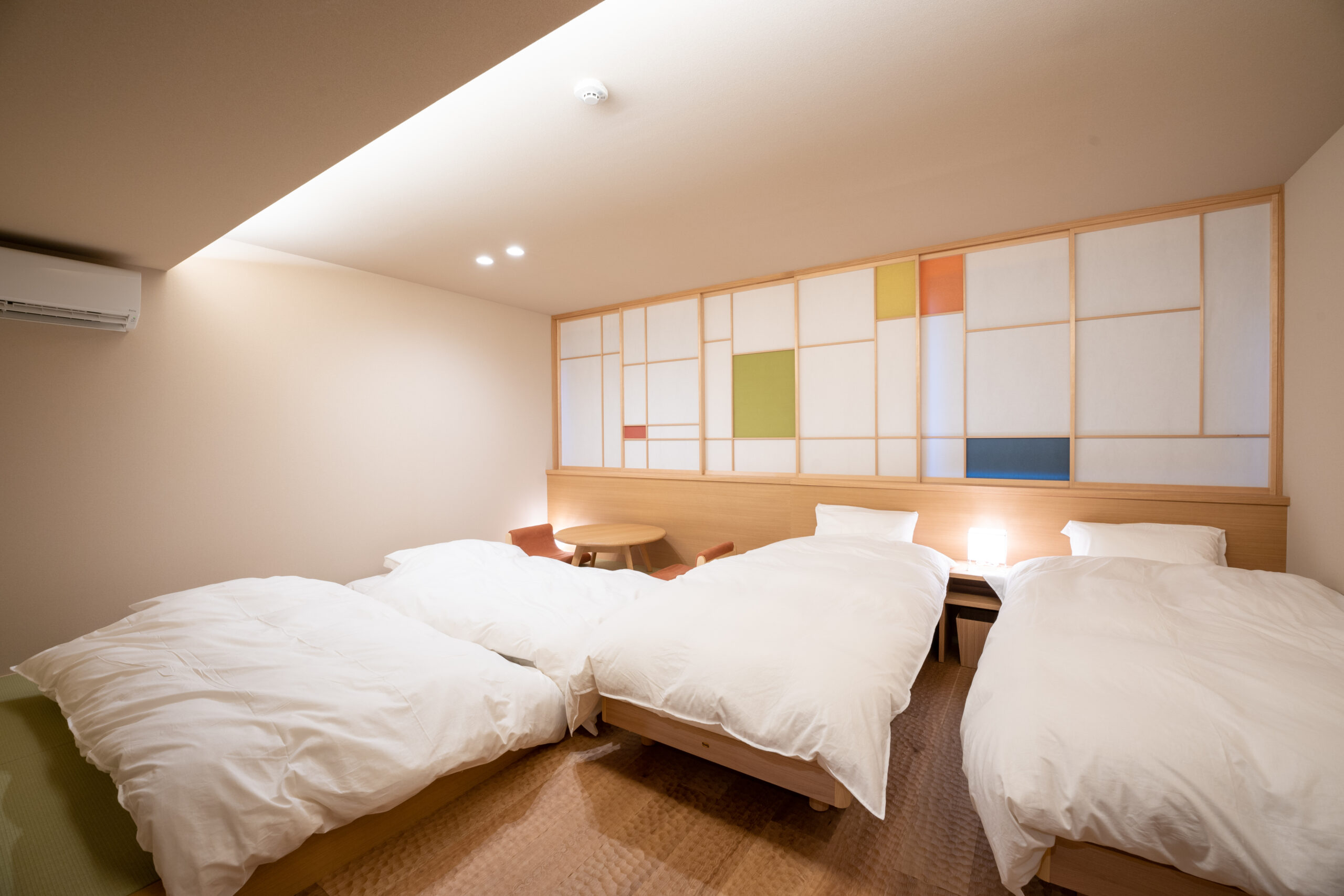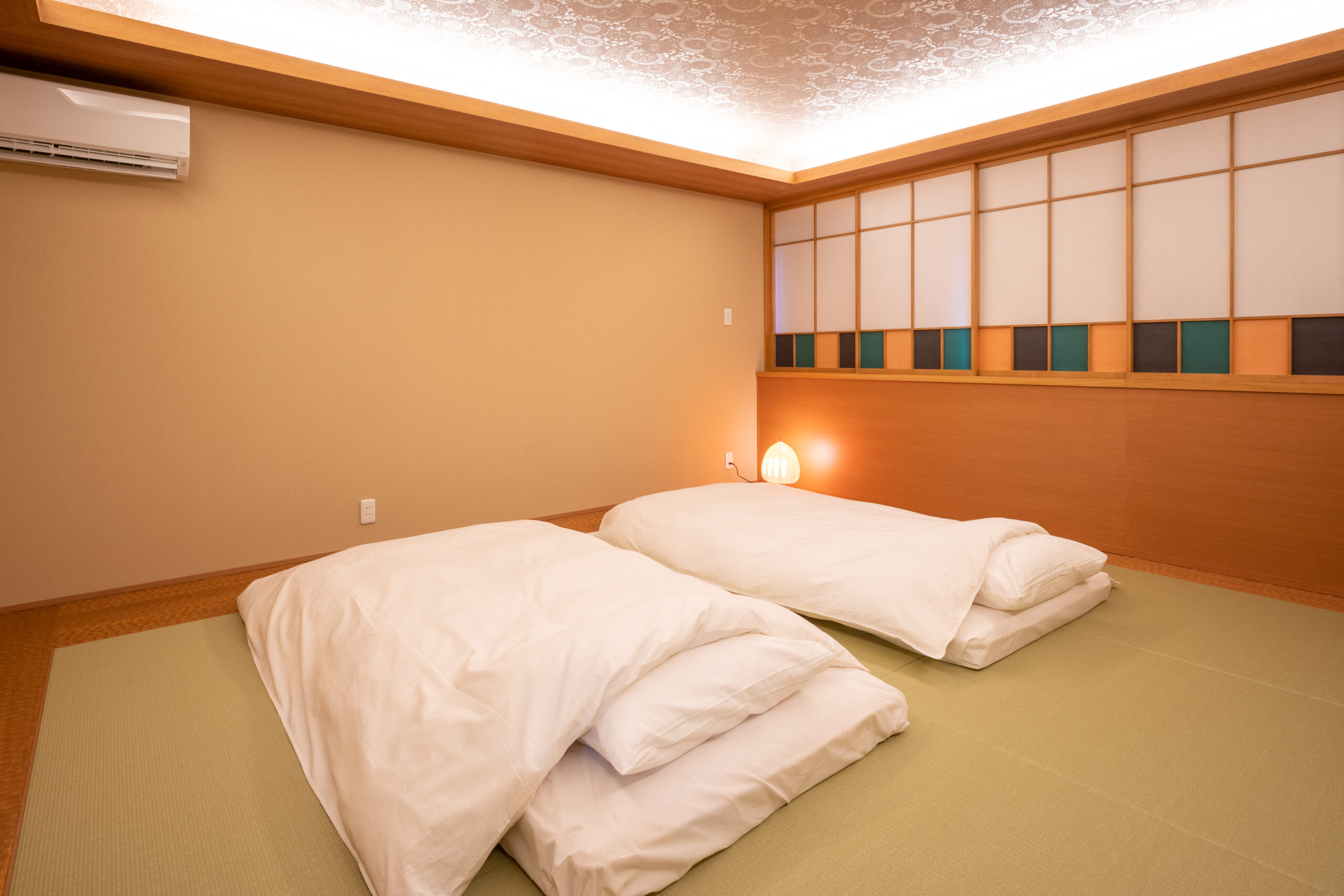 この広々とした和室(畳)には、最大6名までご利用いただける布団をご用意しています。